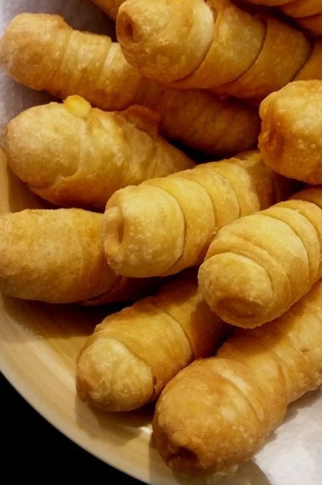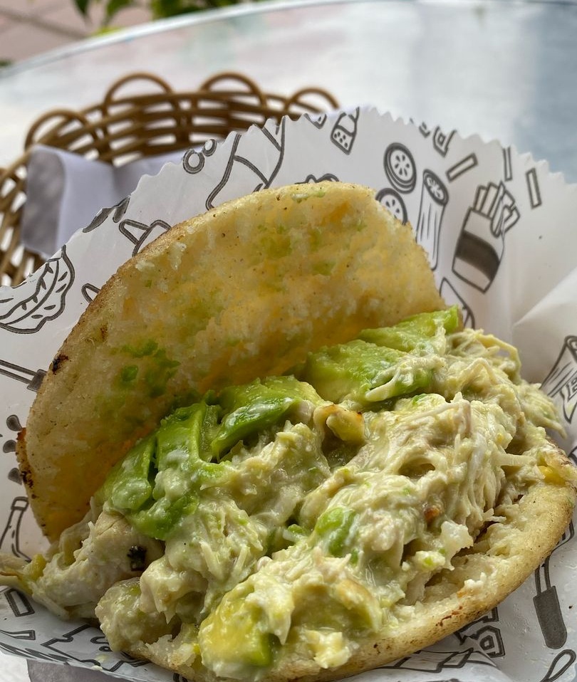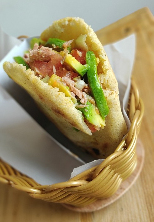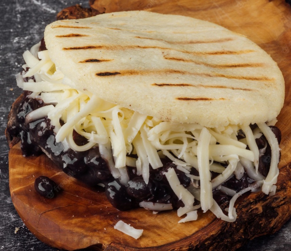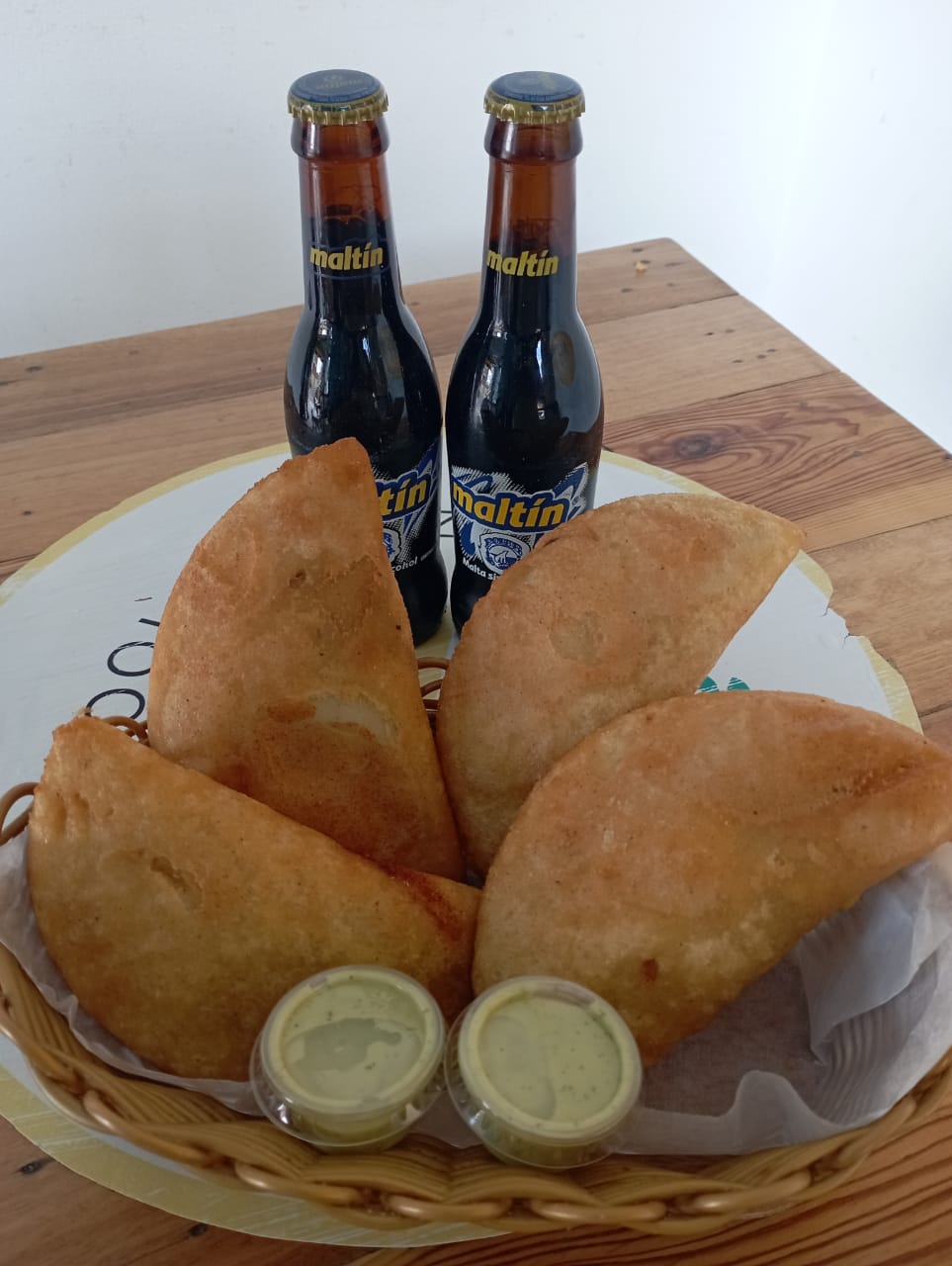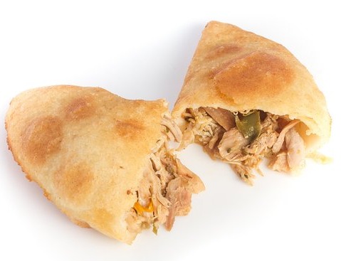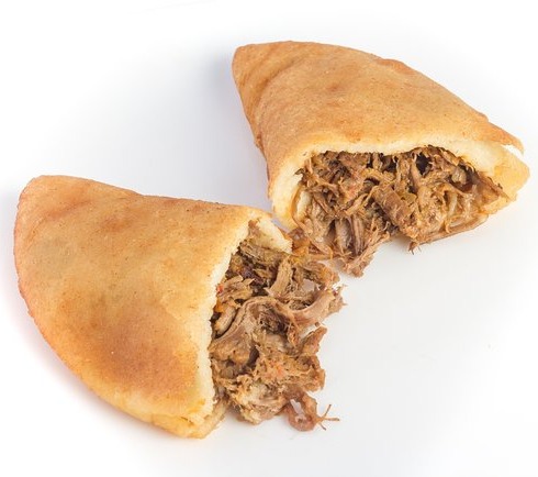 Empanada rellena de carne desmechada, tajadas de plátano maduro, caraotas y queso. Su tamaño es de 18cm aproximadamente. .
