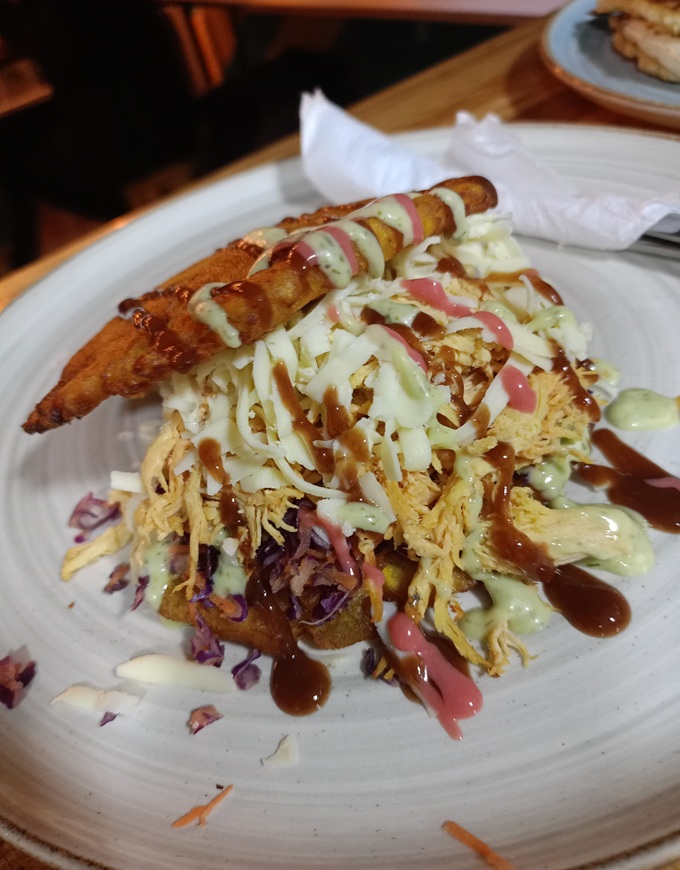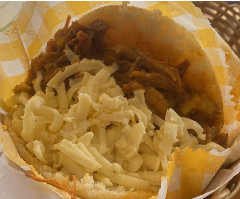 Carne desmechada, tajadas de plátano maduro, caraotas y queso.