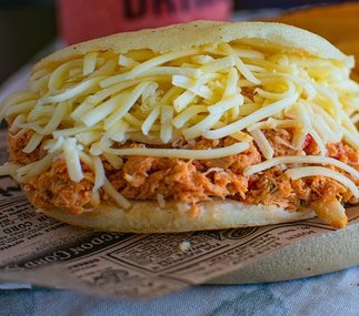 Ensalada de repollo y zanahoria, carne desmechada, pollo, jamón, queso y salsas de tomate, mostaza, BBQ y ajo.