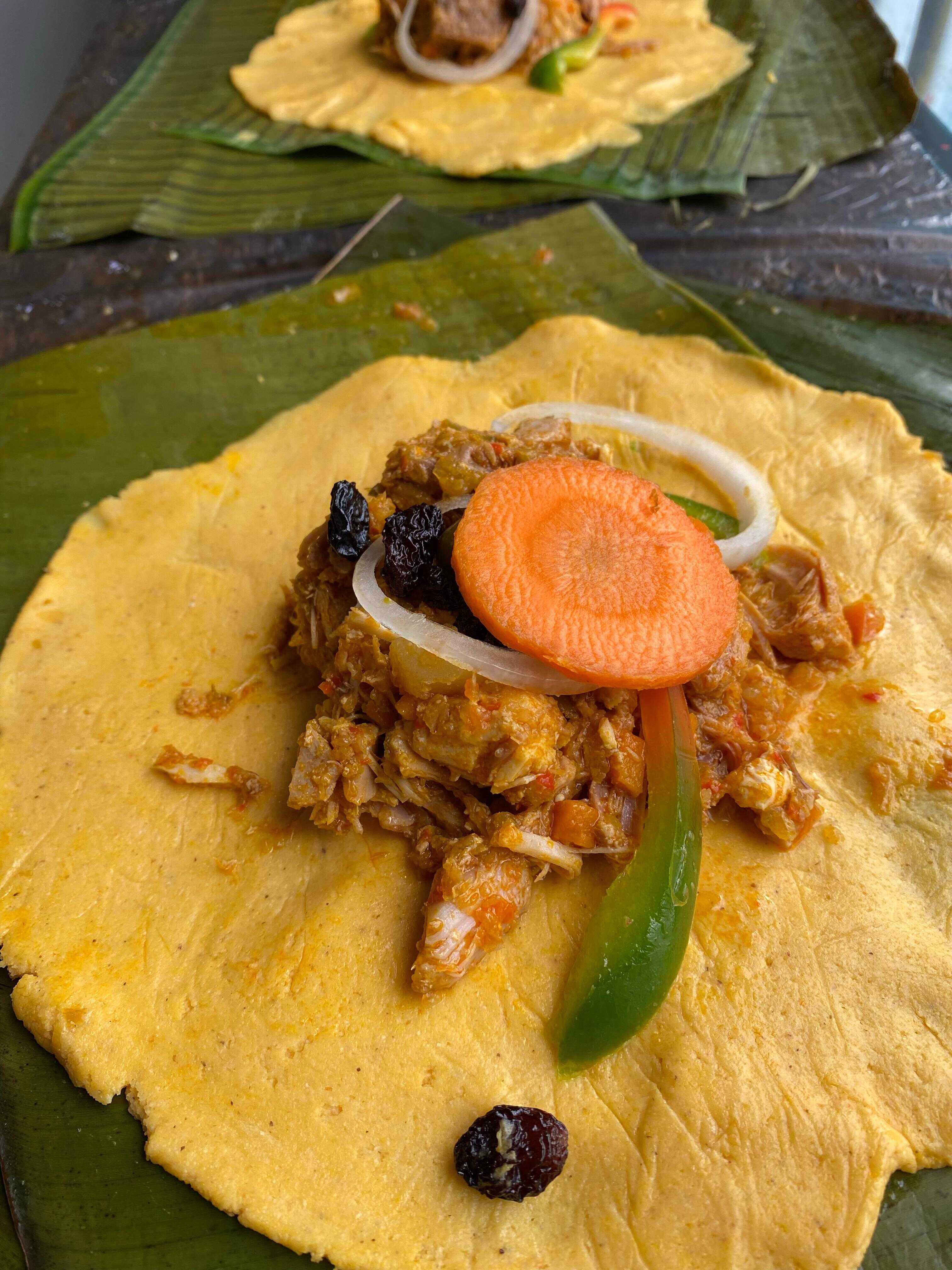 Masa de harina de maíz sazonada con caldo de pollo y onoto, rellena con un guiso cocido y preparado a base de aliños, carne de res, pollo y cerdo. decorada con pimentón, cebolla, zanahoria, aceituna verde y pasas, va envuelta en hoja de plátano
