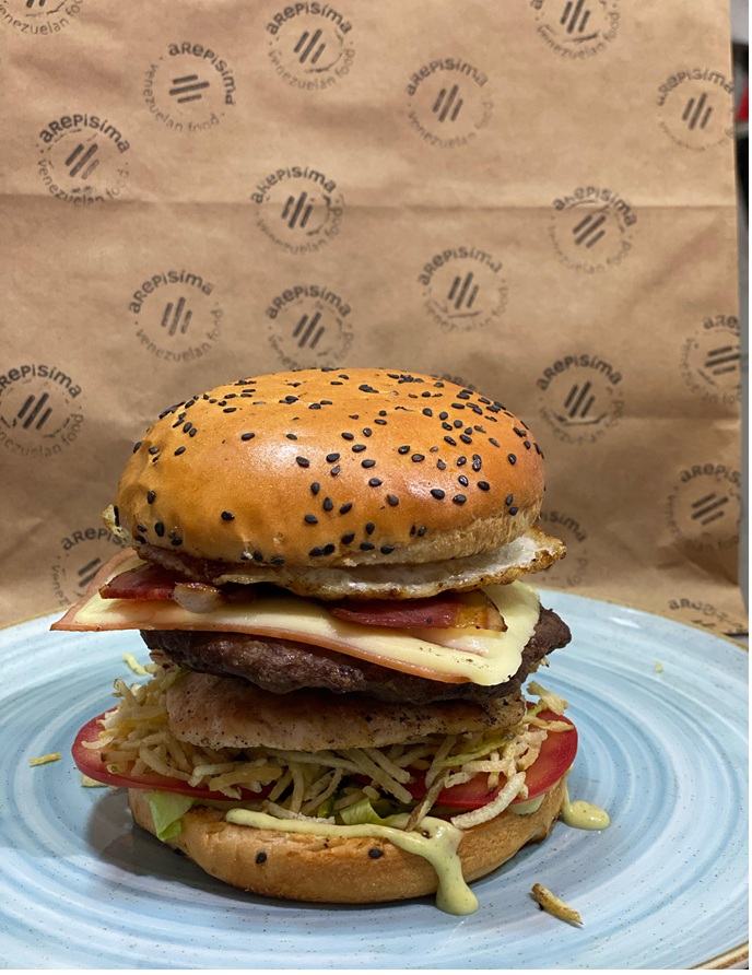 Sándwich de 30 cm de pan, compuesto de carne de res, pollo y cerdo, lechuga, tomate, papas chips, jamón, queso, tocineta y salsas.