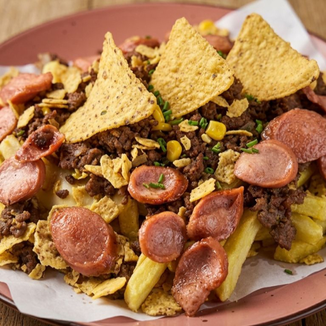 Crujiente pap francesa , carne molida, salchicha y salsa de queso cheddar