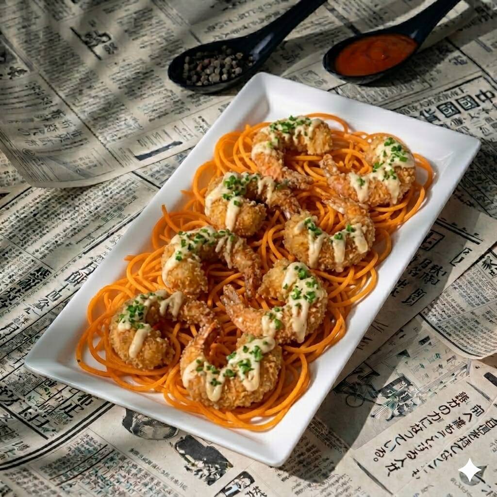 8 camarones crunch, salsa fantasy, cebollín y una cama de zanahoria en espiral.