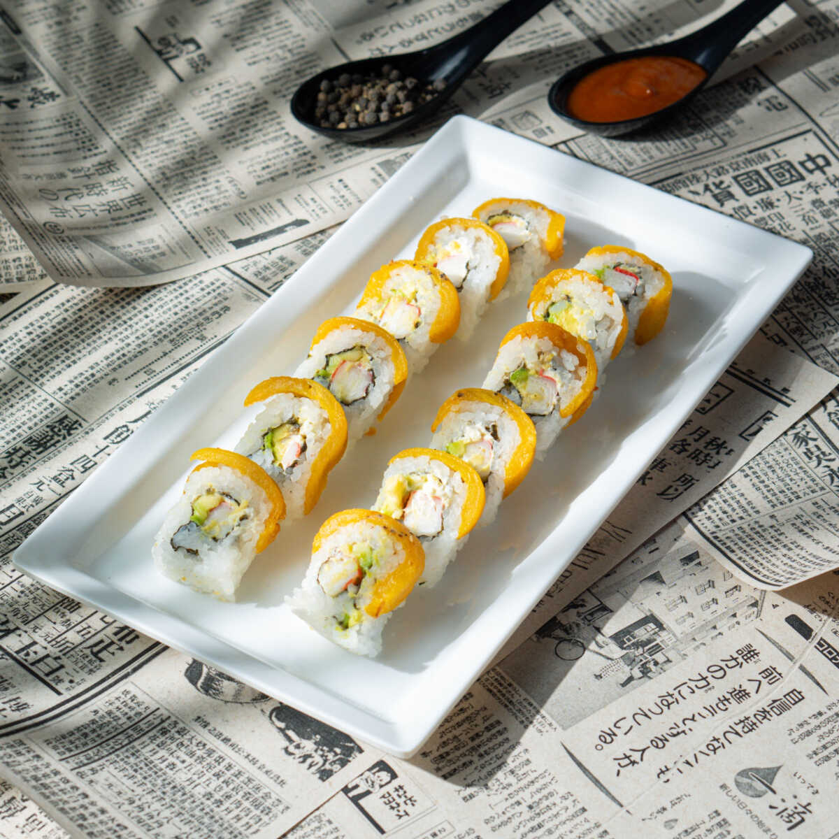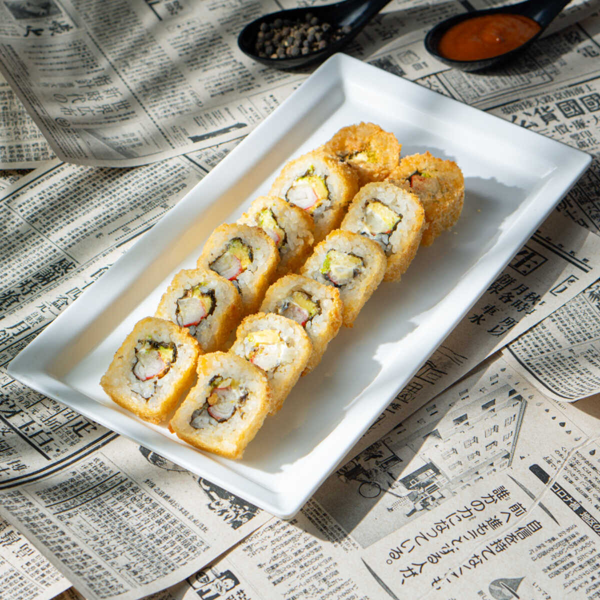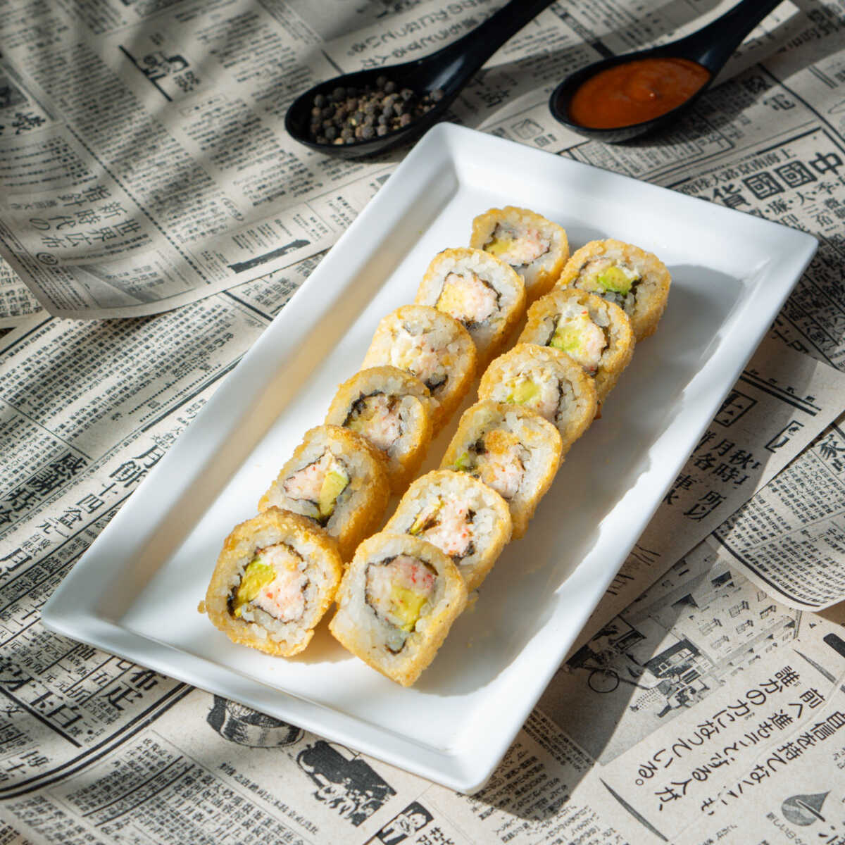 Sushi de Palmito de cangrejo, aguacate, queso crema y todo tempurizado