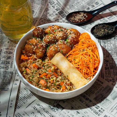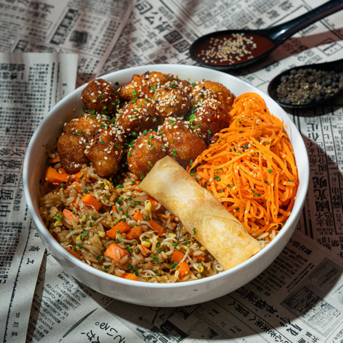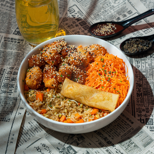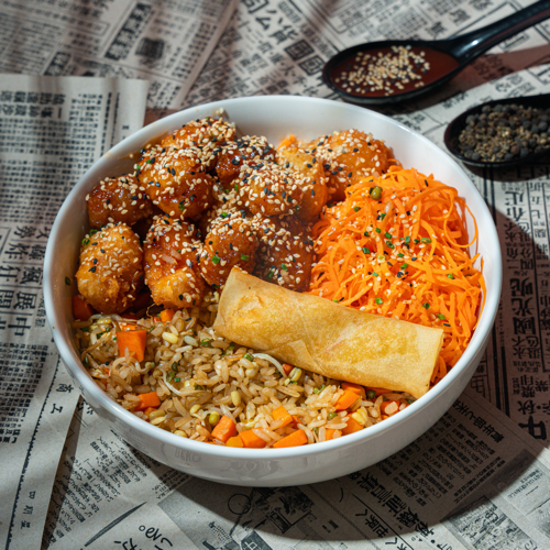 Arroz estilo chino salteado al wok con zanahoria, raíces chinas y salsa soya, pollo crunch bañado en salsa agridulce, zanahoria en espiral, un egg roll, ajonjolí mixto y cebollín.