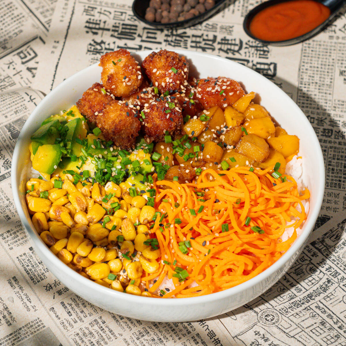 Poke con arroz de sushi, zanahoria, aguacate, pollo tempura bañado en salsa agridulce, plátano maduro, maíz tostado, cebollín y ajonjolí