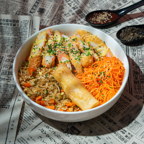Arroz estilo chino salteado al wok con zanahoria, raíces chinas y salsa soya, Salmon crunch bañado en salsa Teriyaki, zanahoria en espiral, un egg roll, ajonjolí mixto y cebollín.