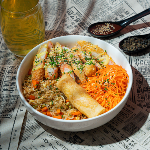 Arroz estilo chino salteado al wok con zanahoria, raíces chinas y salsa soya, camarones crunch bañados en salsa agridulce, zanahoria en espiral, un egg roll, ajonjolí mixto y cebollín.