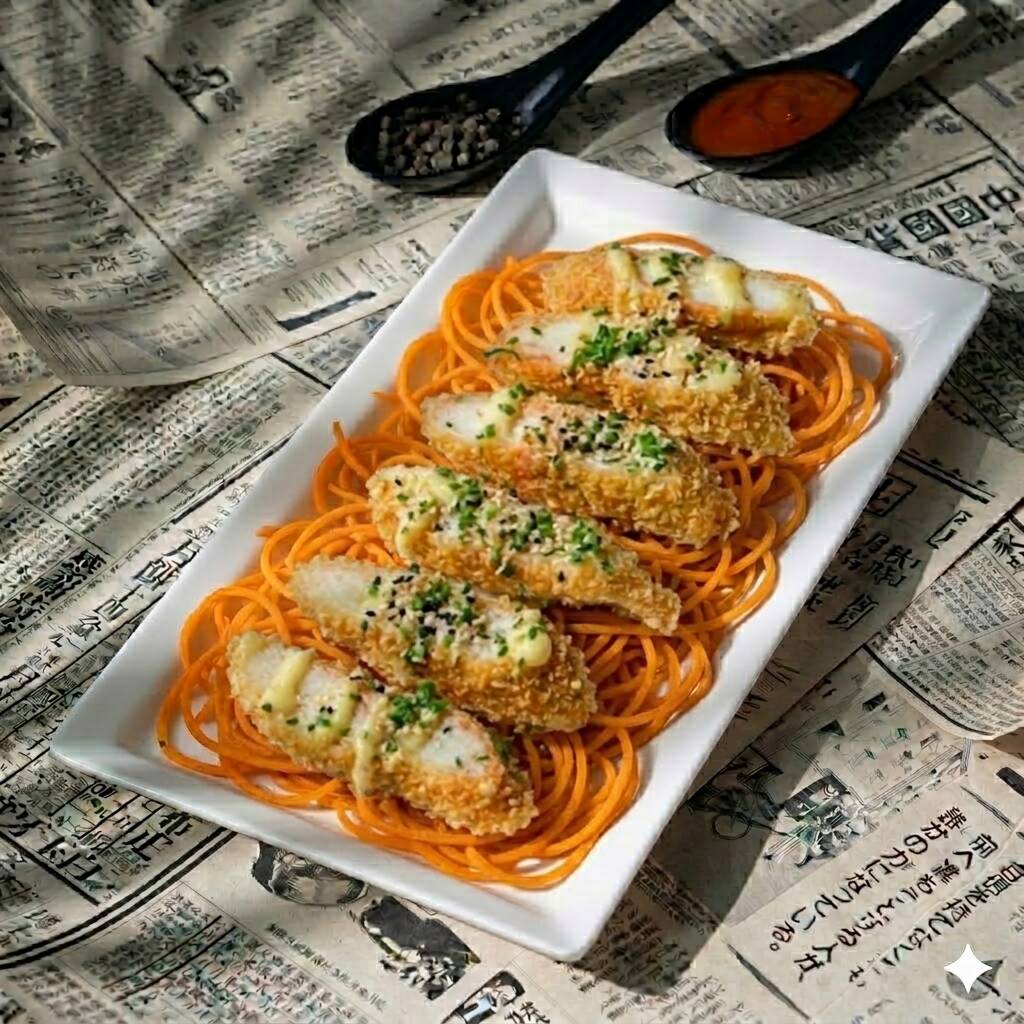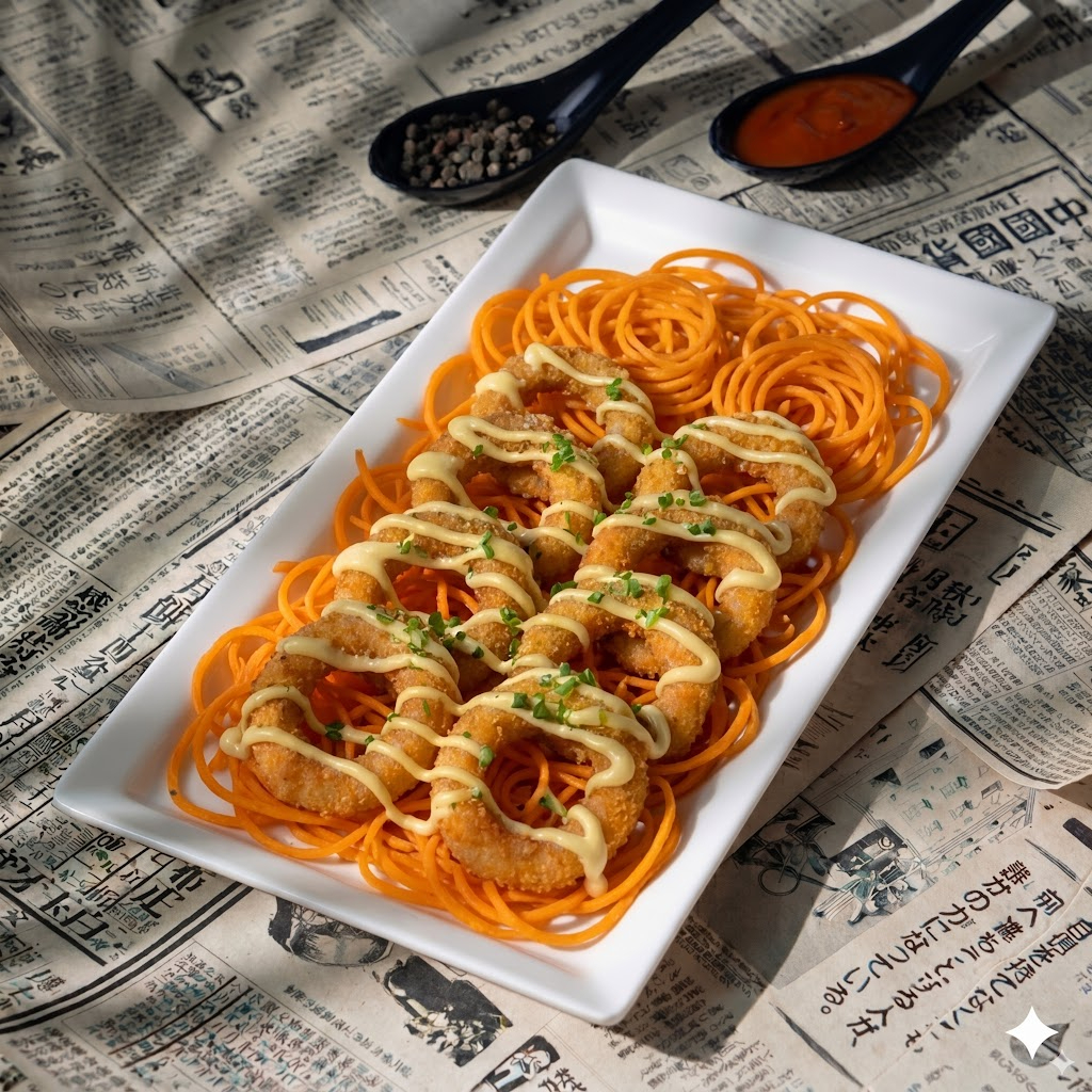 8 camarones crunch, salsa fantasy, cebollín y una cama de zanahoria en espiral.