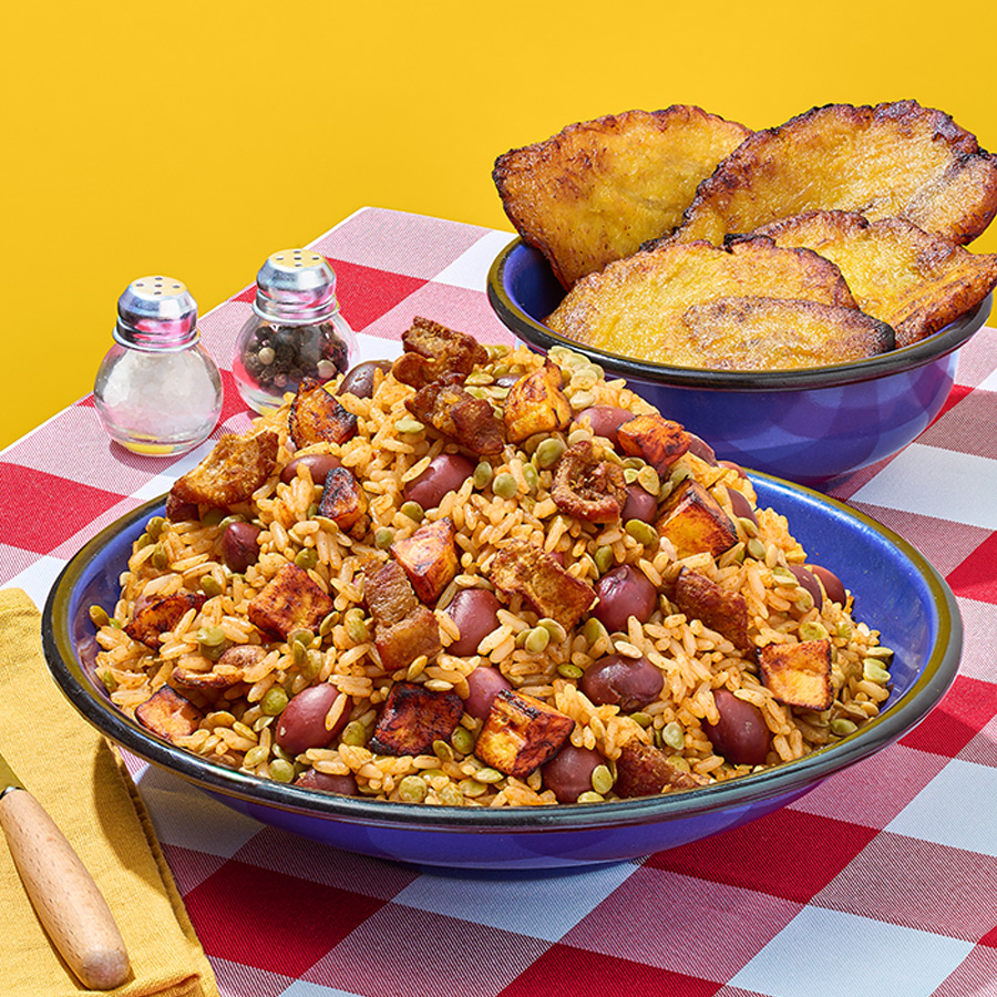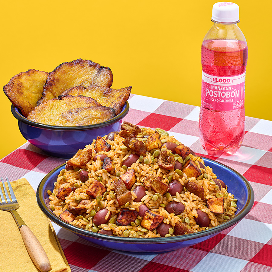 Arroz con chicharrón, plátano, frijol, lentejas + bebida 250 ml.