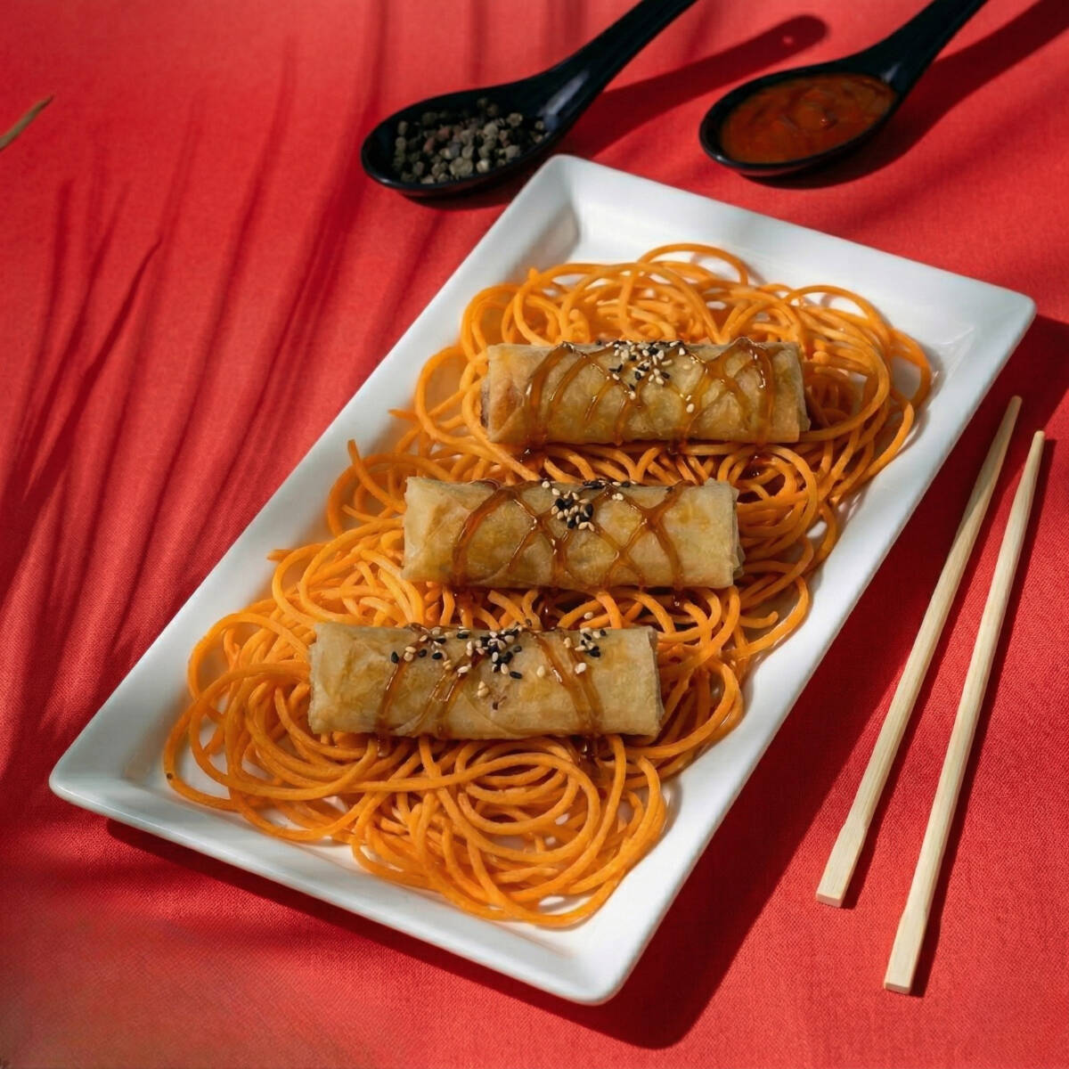 3 spring roll, salsa teriyaki, ajonjolí mixto y una cama de zanahoria en espiral.