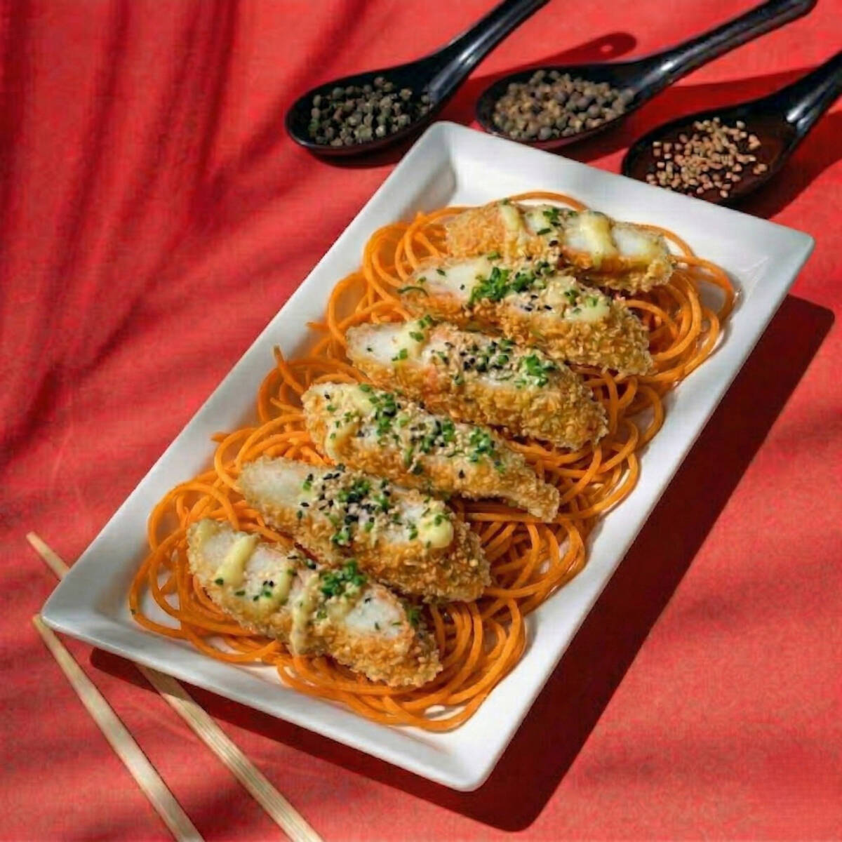 8 camarones crunch, salsa fantasy, cebollín y una cama de zanahoria en espiral.