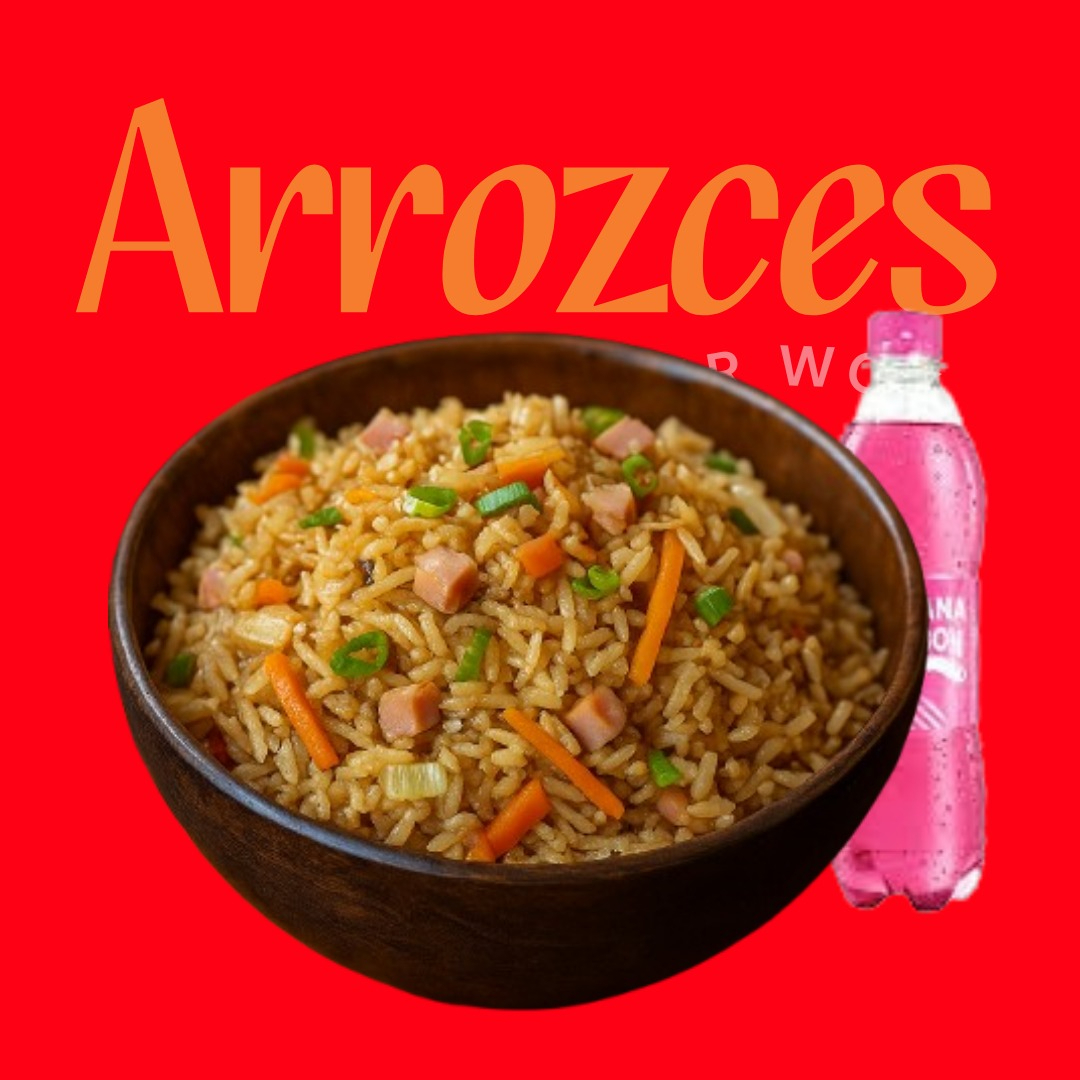 Arroz salteado, zanahoria, jamón, raíz china, cebolla larga, especias y salsa de la casa mas gaseosa Postobón 250 ml.