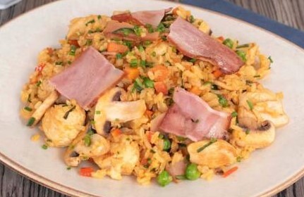 Arroz, Cubos De Pechuga, Tocineta, Jamón, Champiñones, Habichuela, Zanahoria, Arvejas Terminado En Salsa Napolitana