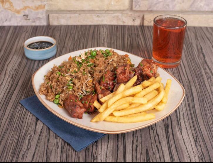 Combo Costillas BBQ: Porción de arroz tepanyaki frito + costillas bbq + porción de papa francesa + bebida a elección.