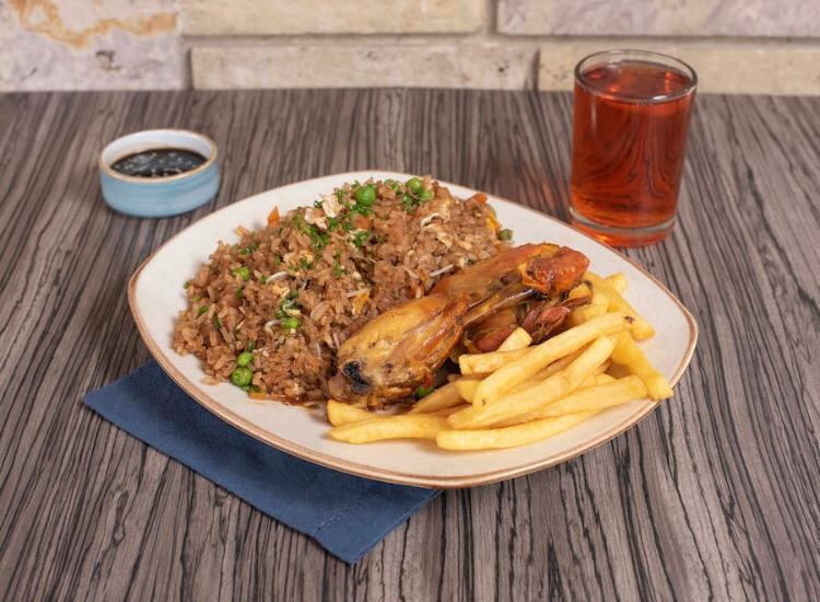 Combo Pollo Teriyaki: Porción de arroz tepanyaki frito + pollo teriyaki + porción de papa francesa + bebida a elección.
