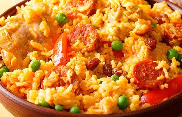 Arroz, Carne De Res, Carne De Cerdo, Chorizo, Cubos De Pechuga De Pollo, Arvejas, Zanahoria, Pimentón, En Su Salsa De Ahogao