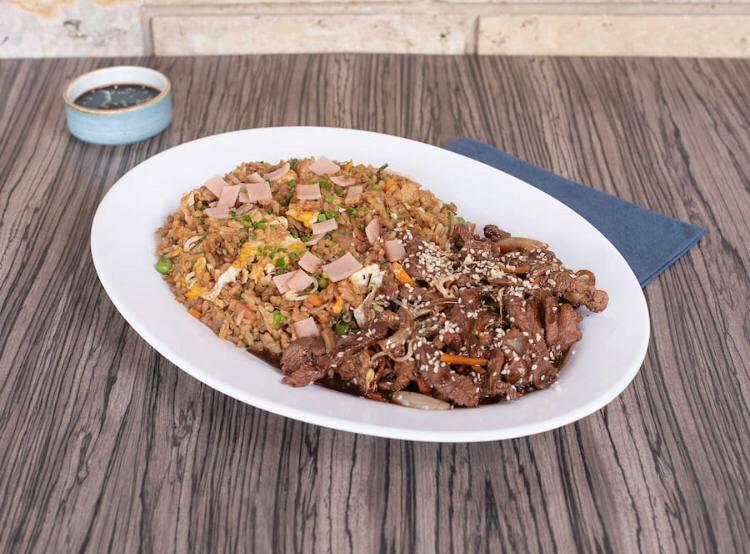 Arroz tepanyaki (huevo, cebollín, zanahoria, arvejas, raíces chinas, terminado en salsa soya) carne teriyaki (vegetales y carne de res terminada en salsa)