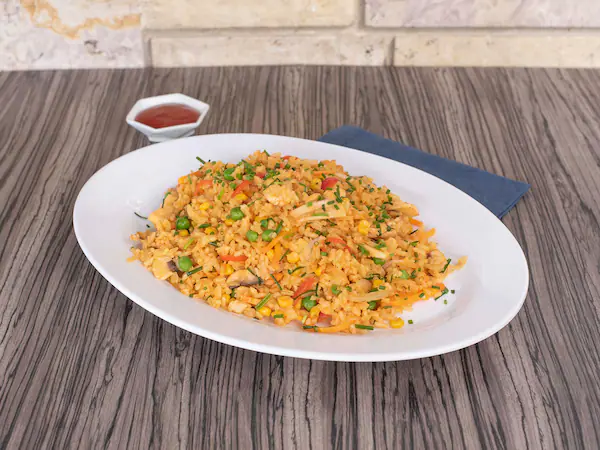 Arroz, Cubos De Pechuga, Tocineta, Jamón, Champiñones, Habichuela, Zanahoria, Arvejas Terminado En Salsa Napolitana.