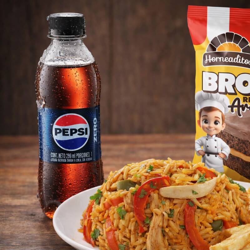 porcion de arroz con pollo de la abuela 400gr + pocion de papa ala francesa + gaseosa 250ml + mini brownies