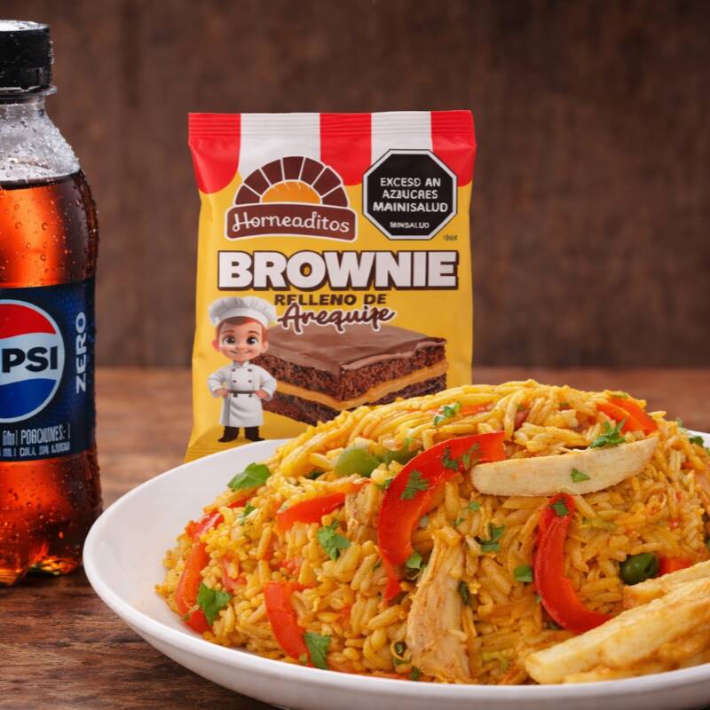 Porcion de arroz con pollo de la abuela 400gr + porcion de papa ala francesa + gaseosa 250ml + mini brownies