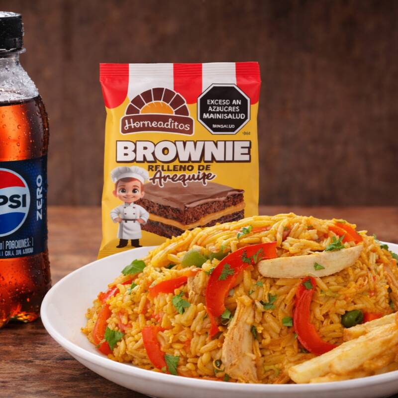 Porcion de arroz con pollo de la abuela 400gr + porcion de papa ala francesa + gaseosa 250ml + mini brownies