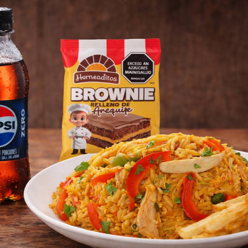 Porcion de arroz con pollo de la abuela 400gr + porcion de papa ala francesa + gaseosa 250ml + mini brownies