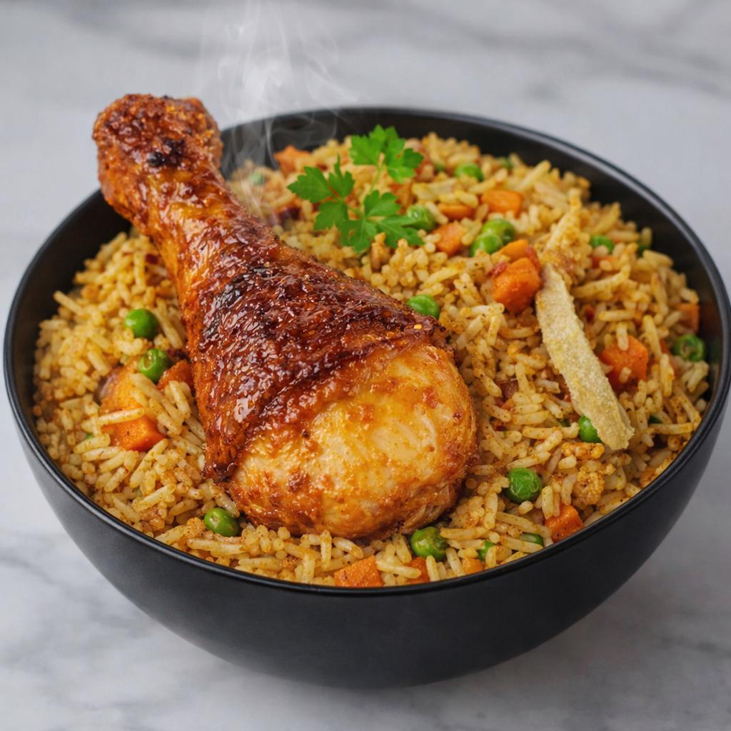 500 gr de arroz con pollo mas pierna pernil de pollo frita