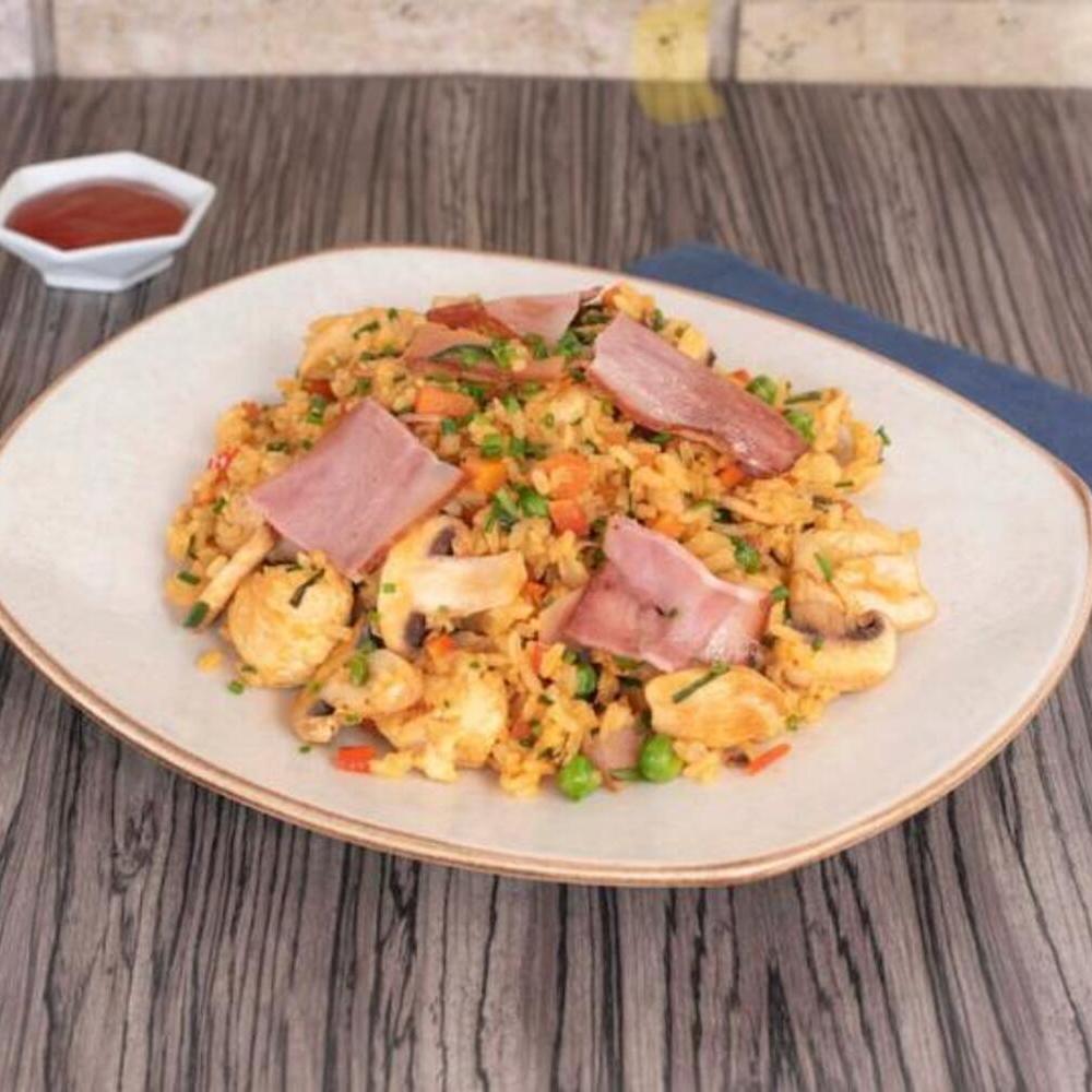 Arroz, Cubos De Pechuga, Tocineta, Jamón, Champiñones, Habichuela, Zanahoria, Arvejas Terminado En Salsa Napolitana