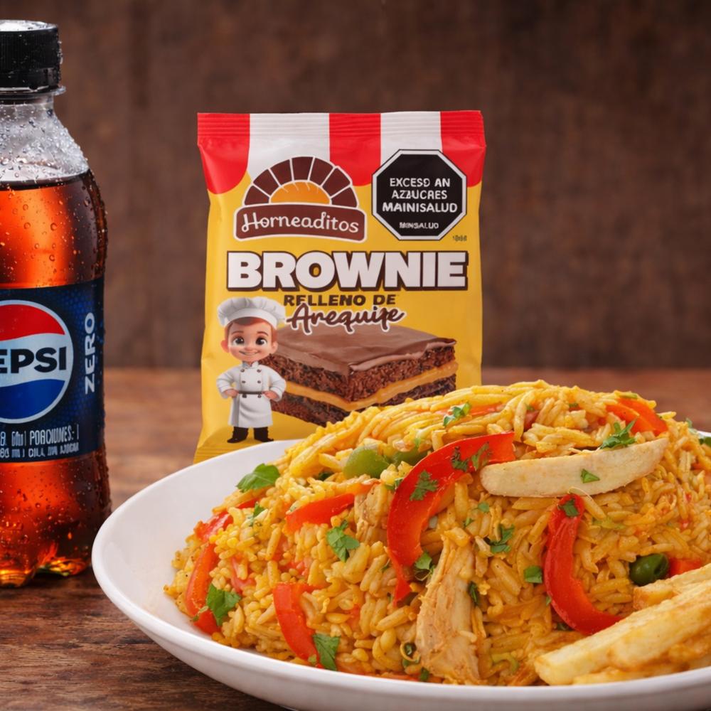 Porcion de arroz con pollo de la abuela 400gr + porcion de papa ala francesa + gaseosa 250ml + mini brownies