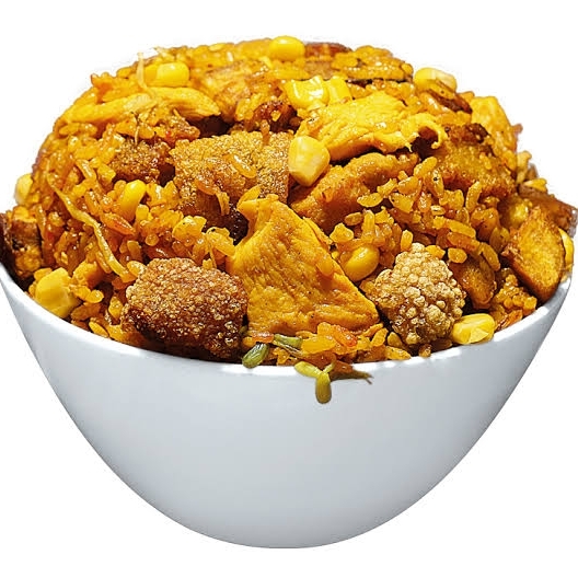 Arroz, chicharrón, maíz tierno, chorizo y plátano maduro.