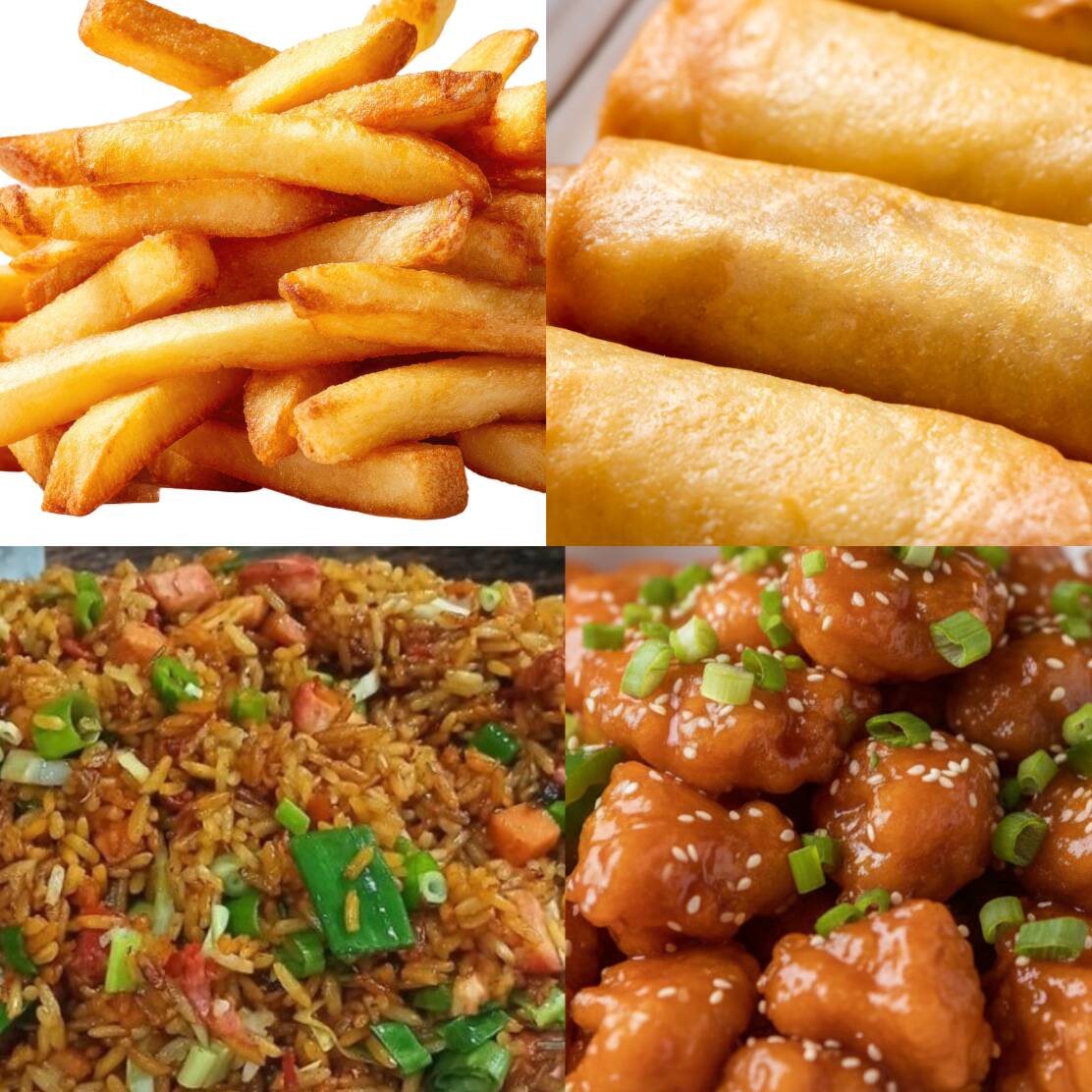 La cena completa para dos: 2 arroz chino sencillo , Salteado con pollo , Costillitas y jamon ahumado ,raíz china y cebollín + 2 lumpias crujientes.