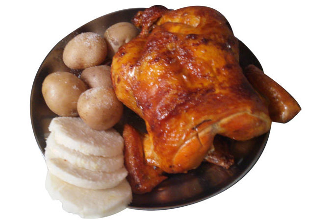 1 Pollo asado con 4 papas saladas y 4 arepas.
