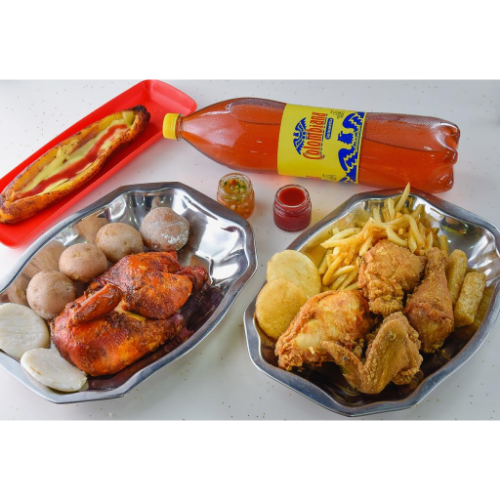 1 Pollo broaster y 1/2 asado, papa salada, papa francesa, maduro, arepa y gaseosa 1 L.