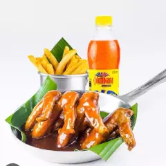 12 alitas bañadas en salsa BBQ y papa a la francesa