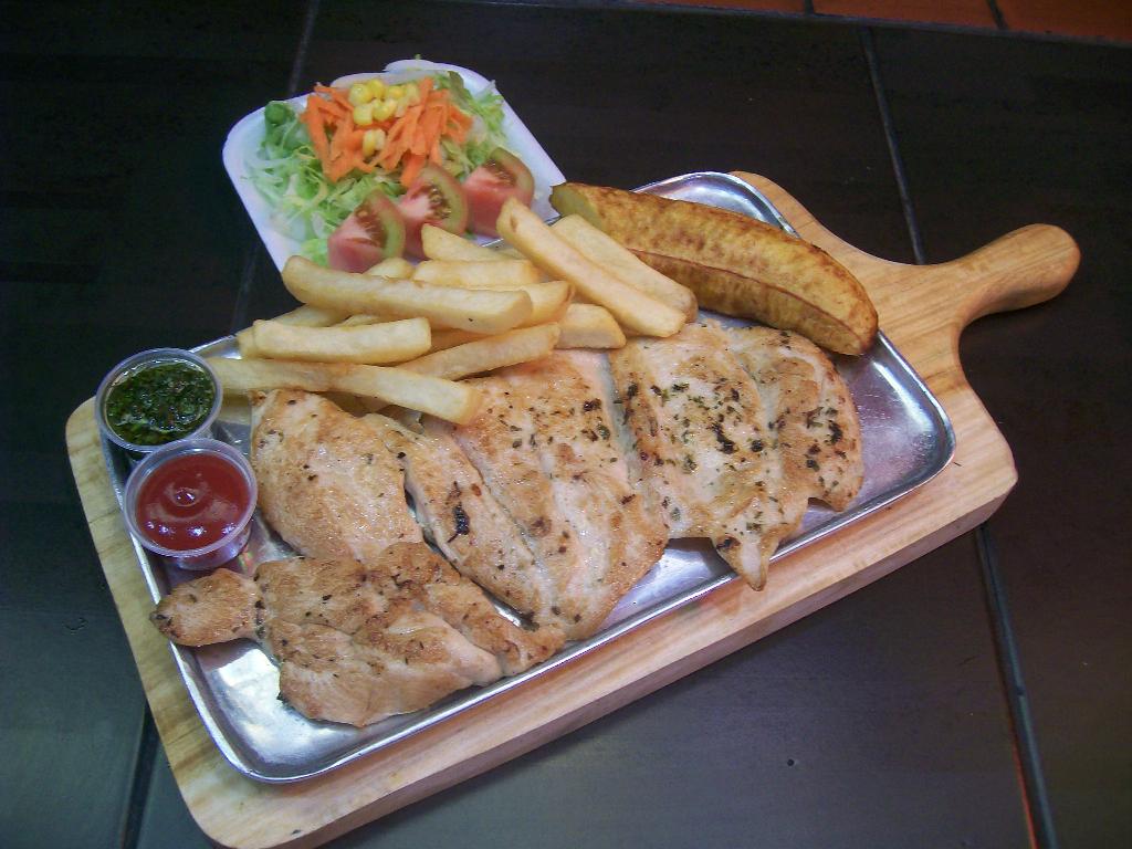 180 Gr de carne asada, 120 gr de pechuga, arroz blanco, papa a la francesa, yuca, patacón y ensalada.
