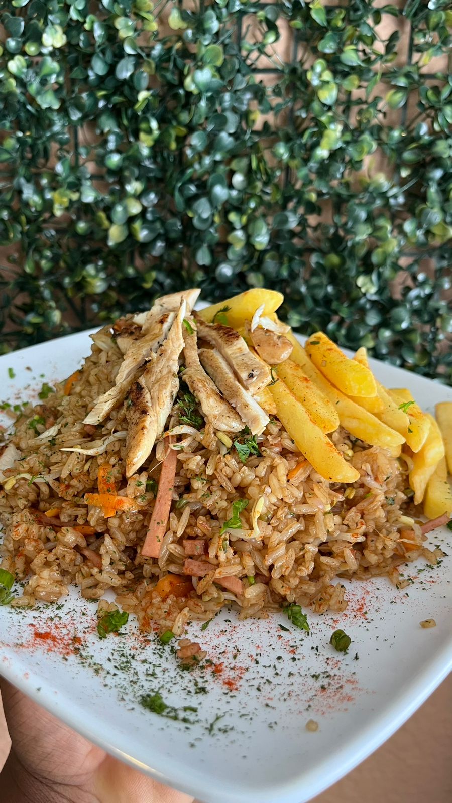 300GR de arroz salteado a las finas hierbas con jamon ahumado de cerdo,50gr pollo, raices chinas, cebollin, cebolla con salsa agridulce, soya y ajonjolí + Bebida+ papa fritas