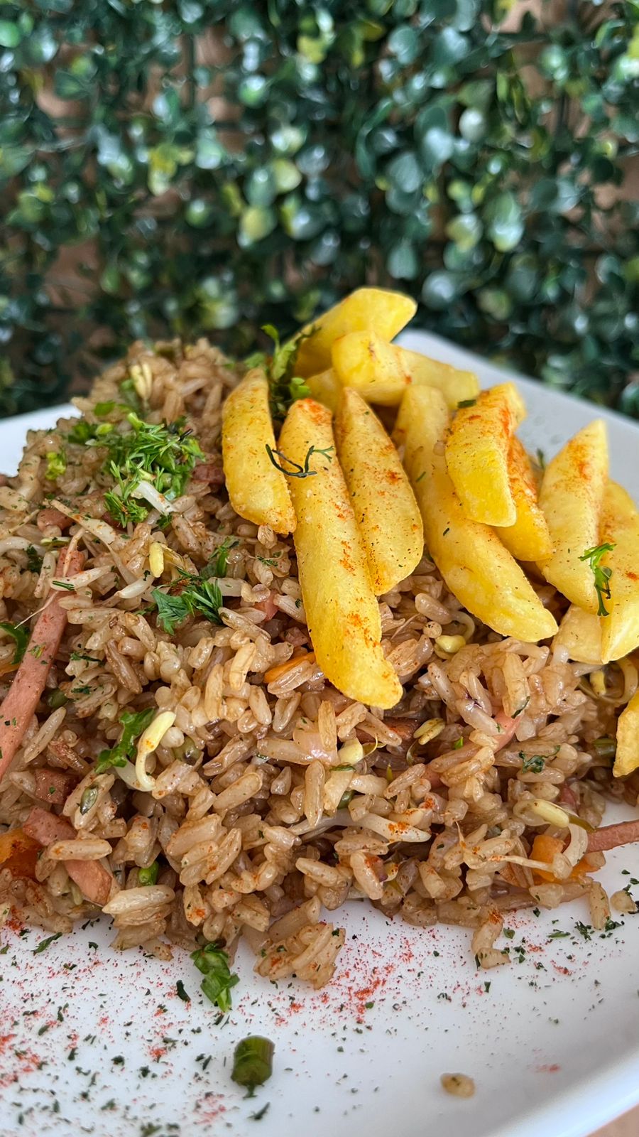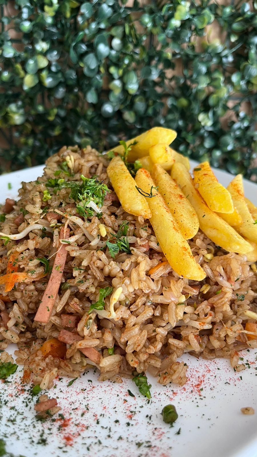300 GR de arroz salteado a las finas hierbas con jamón ahumado de cerdo, raices chinas, cebollin, cebolla con salsa agridulce, soya y ajonjolí + Bebida + 100 GR de papa frita