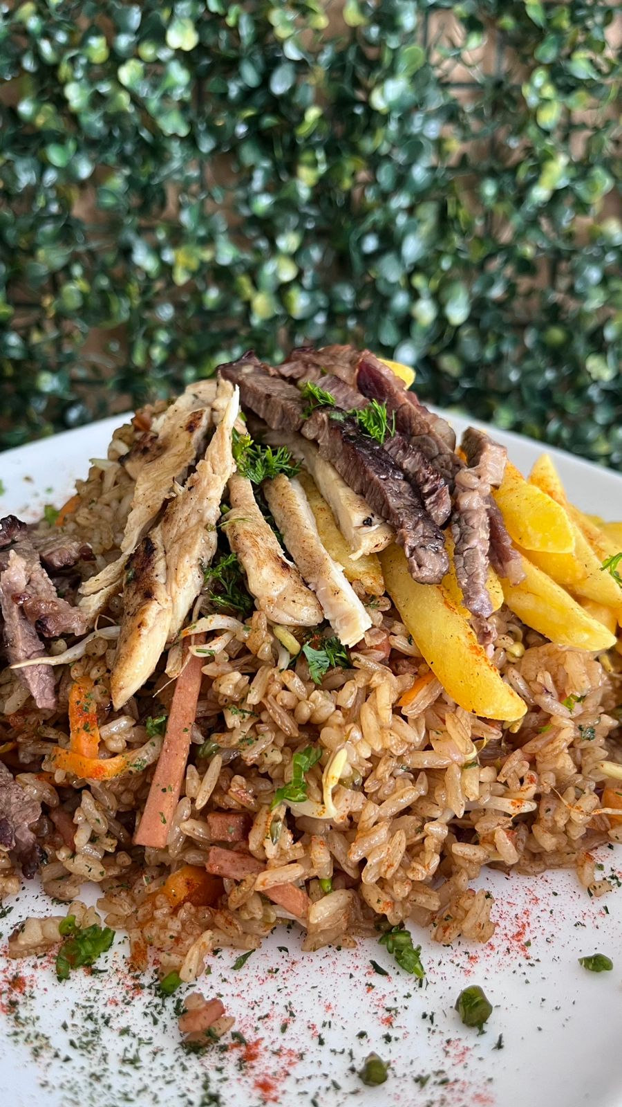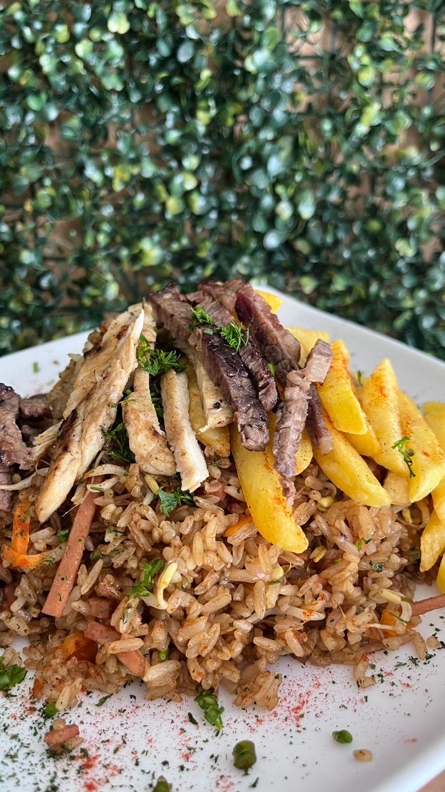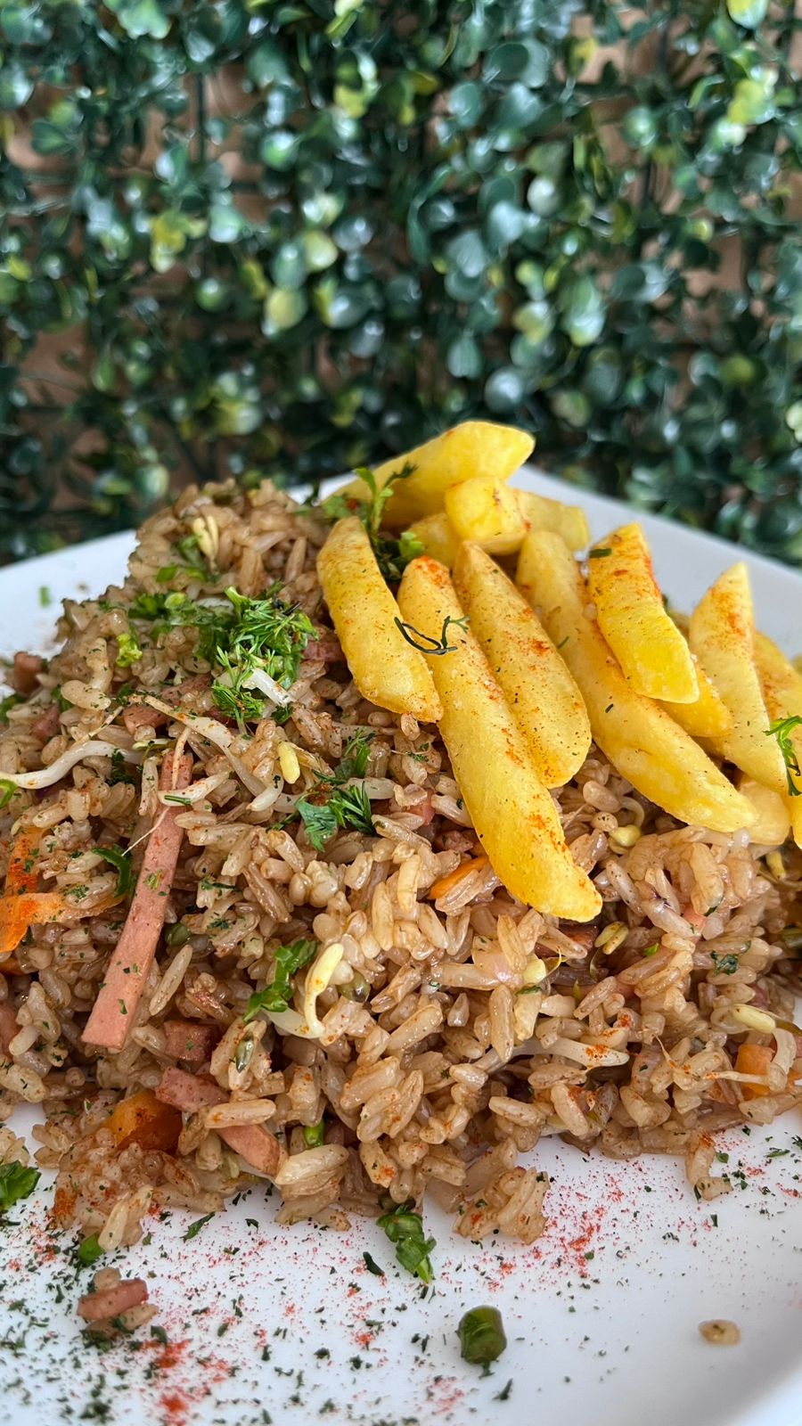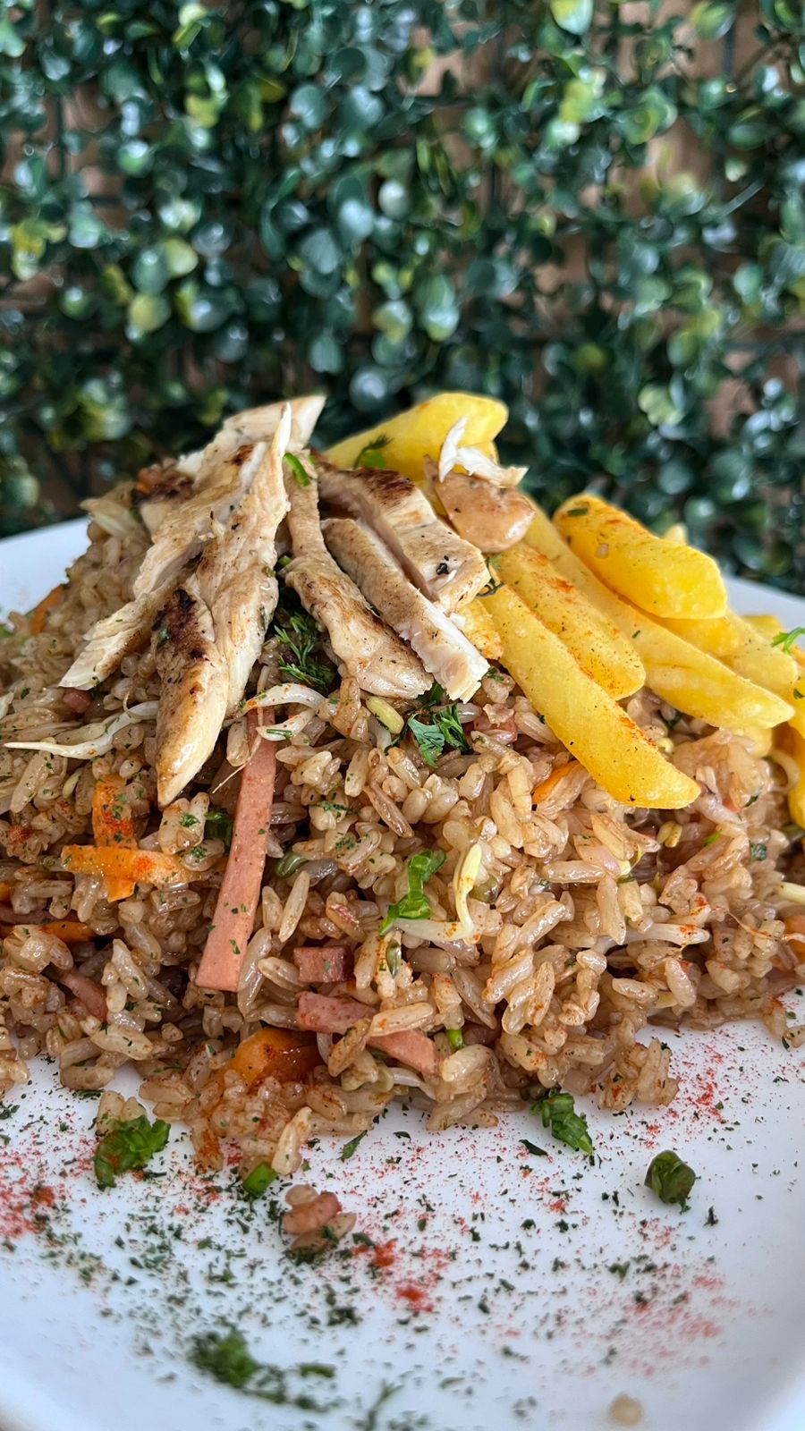 500 GR de arroz salteado a las finas hierbas con jamon ahumado de cerdo, 75 gr de pollo, raices chinas, cebollin, cebolla con salsa agridulce, soya y ajonjolí + Bebida+ papa frita