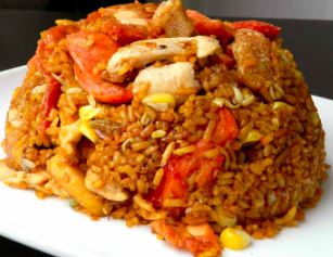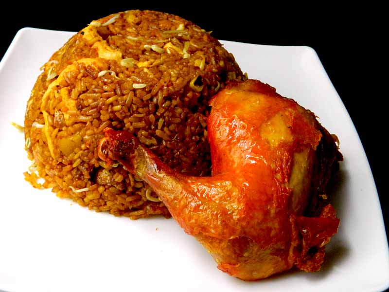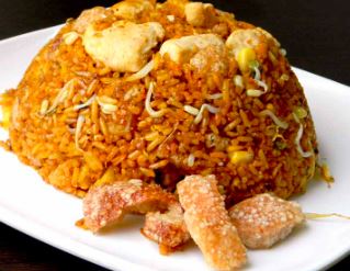 Arroz, pollo, pernil de cerdo, chicharrón, plátano maduro, maiz, raices chinas - 500gr + 100gr papa a la francesa