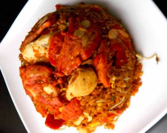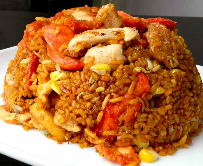 Arroz, pollo, pernil de cerdo, chicharrón, costilla ahumada, chorizo de ternera, plátano maduro, maiz, raices chinas - 2000gre ternera y maicitos.