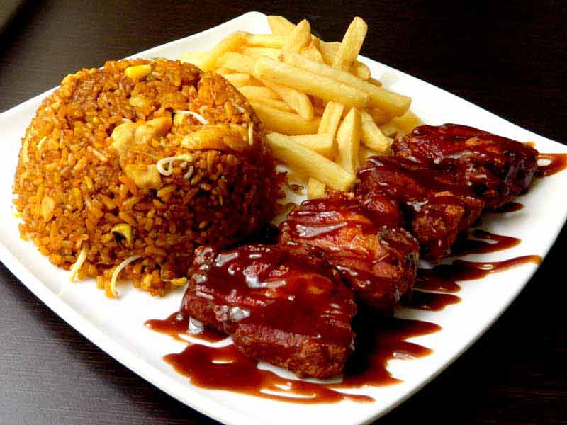 Costillas de cerdo con salsa BBQ, arroz paisa o ranchero, papa a la francesa o chop suey a elección.
