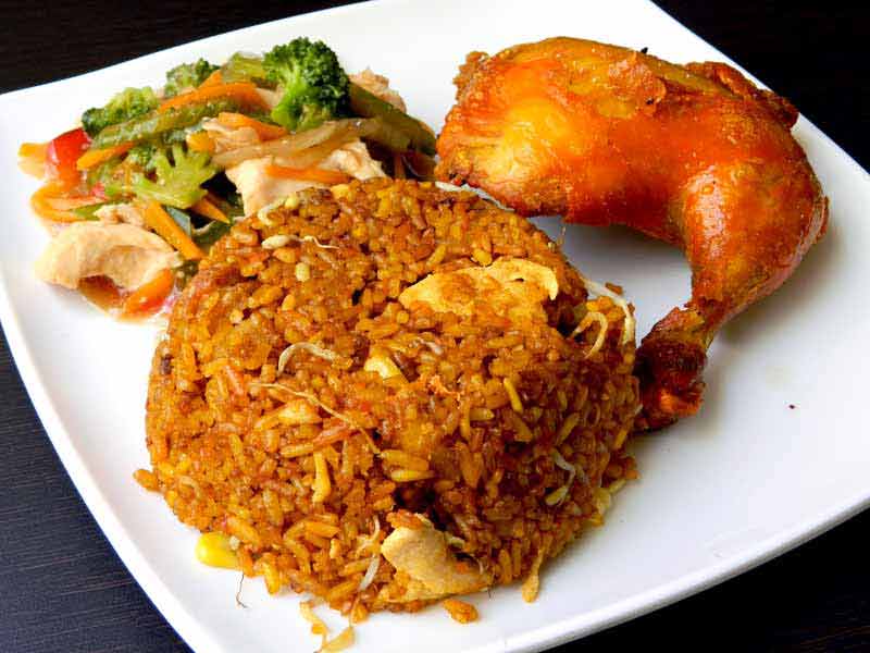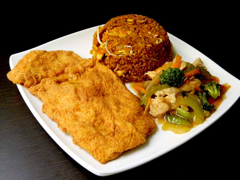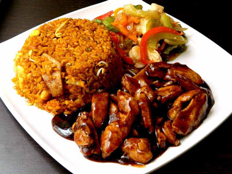 Trocitos de pollo con salsa a la naranja, arroz paisa o ranchero, papa a la francesa o chop suey a elección.