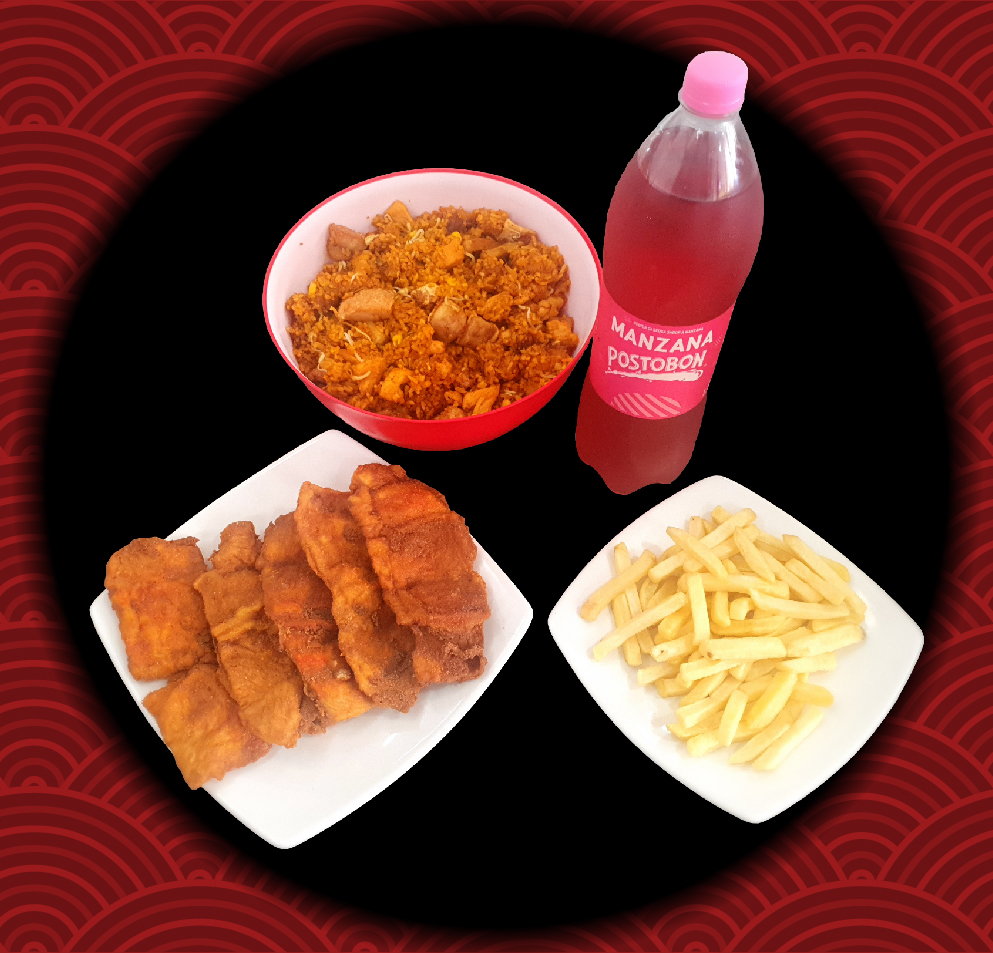 Arroz paisa familiar, 5 chuletas de pollo, papa a la francesa, gaseosa 1.5L a elección.