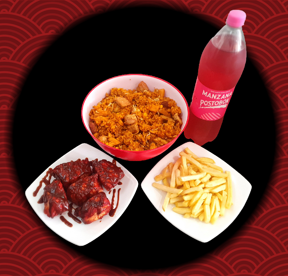 Arroz paisa familiar, 5 alitas fritas con salsa BBQ, papa a la francesa, gaseosa 1.5L a elección.