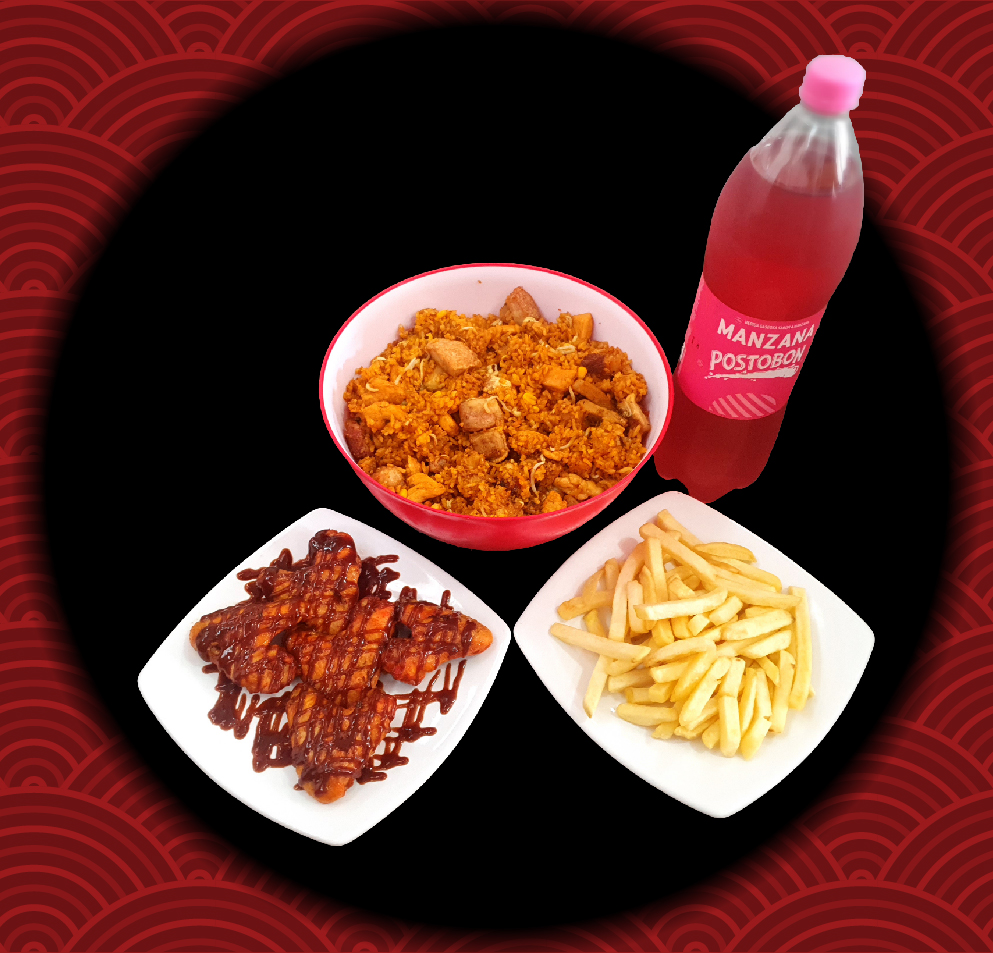 Trocitos de pollo en salsa teriyaki, arroz paisa o ranchero, papa a la francesa o chop suey a elección.