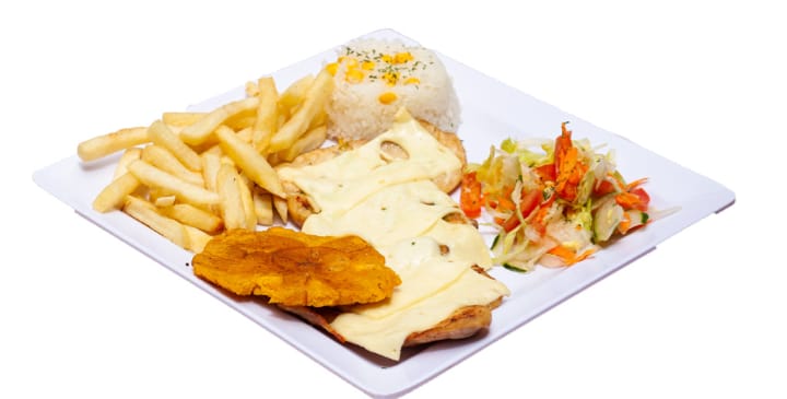 Acompañados de porción Arroz blanco, francesa, yuca y ensalada de (lechuga, tomate, maiz dulce)