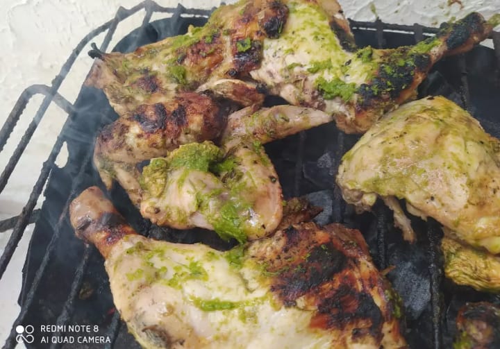 pollo Al carbón, con salsa de la casa a base de ajo y finas hierbas) Acompañados de papa francesa y yuca.
