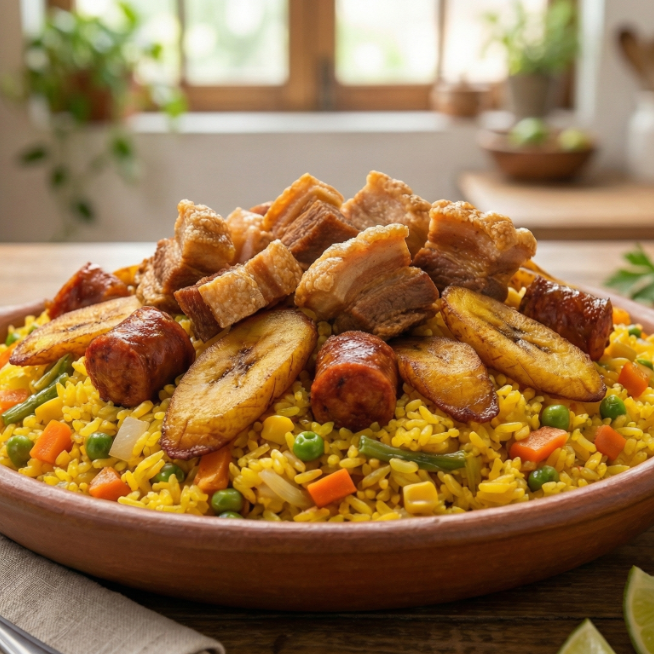 Delicioso arroz salteado con verduras (zanahoria y alverja), con lomo de cerdo, chorizo ranchero, salchicha ranchera, plátano maduro, chicharrón, maíz tierno y porción de papa a la francesa.