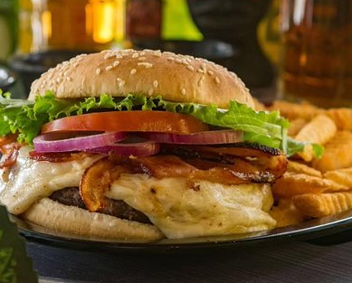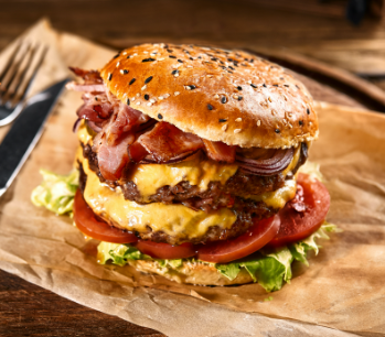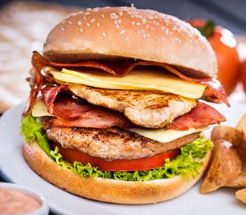 Deliciosa hamburguesa de carne y pechuga con jamón, queso, tomate, cebolla, lechuga, papas, gaseosa mini 250 ml (Manzana, Colombiana, Limonada).